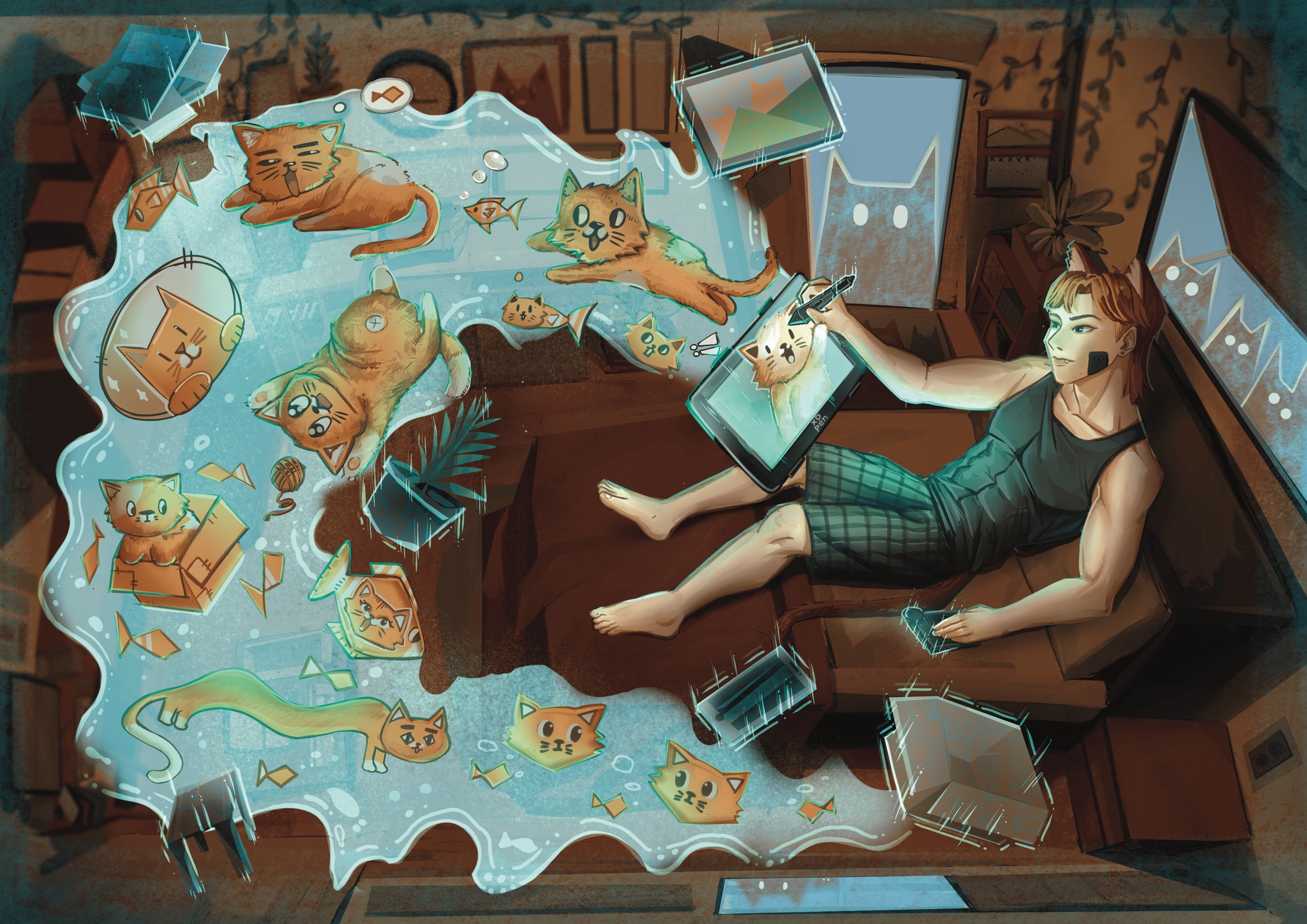 คำอธิบาย : ภาพนี้สะท้อนตัวผม ผ่าน “แมวสีส้ม” หลายๆตัวที่ได้จากไปสู่ดาวของมันแล้วด้วยความคิดถึง ผมจึงหยิบมันกลับมามีชีวิตอีกครั้งผ่านการวาดโลกในจินตนาการและโลกแห่งความฝันก็ค่อย ๆ หลอมรวมเป็นหนึ่งเดียวเส้นสายและสีสันที่ปรากฏบนจอ ไม่ใช่แค่ภาพวาด แต่คือความทรงจำที่ยังคงหายใจเหล่าแมวส้มที่จากกันไปนานแสนนานค่อย ๆ ปรากฏตัวขึ้นอีกครั้ง ผ่านหน้าจอดิจิทัลราวกับว่าพวกมันไม่เคยหายไปไหนเลย มันยังคงอยู่ในความทรงจำของผมเสมอ